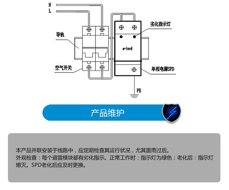 1. 已有可靠接地系統,在配電柜(避雷器安裝處)的接地樁 (條)上進(jìn)行接地電阻的測定,電阻應符合相關(guān)規范要求。 (或滿(mǎn)足國家、部級標準)。 2. 配電柜中應留有安裝避雷器的空間, 注:L為電源相線(xiàn);N為電源零線(xiàn);PE為地線(xiàn)。 | 應檢查空氣開(kāi)關(guān)已經(jīng)合閘導通,以保證避雷器處于運行狀態(tài); 不要在雷雨天安裝。 |