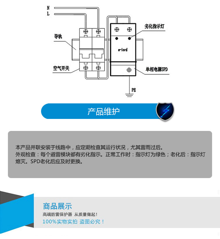 1. 已有可靠接地系統,在配電柜(避雷器安裝處)的接地樁 (條)上進(jìn)行接地電阻的測定,電阻應符合相關(guān)規范要求。 (或滿(mǎn)足國家、部級標準)。 2. 配電柜中應留有安裝避雷器的空間, 注:L為電源相線(xiàn);N為電源零線(xiàn);PE為地線(xiàn)。 | 應檢查空氣開(kāi)關(guān)已經(jīng)合閘導通,以保證避雷器處于運行狀態(tài); 不要在雷雨天安裝。 |
