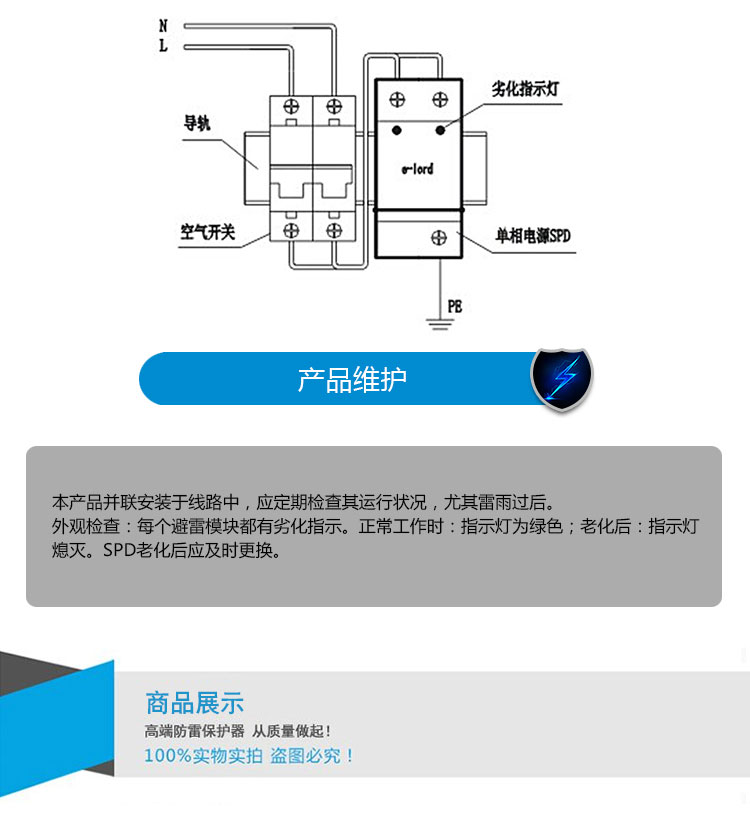 1. 已有可靠接地系統,在配電柜(避雷器安裝處)的接地樁 (條)上進(jìn)行接地電阻的測定,電阻應符合相關(guān)規范要求。 (或滿(mǎn)足國家、部級標準)。 2. 配電柜中應留有安裝避雷器的空間, 注:L為電源相線(xiàn);N為電源零線(xiàn);PE為地線(xiàn)。 | 應檢查空氣開(kāi)關(guān)已經(jīng)合閘導通,以保證避雷器處于運行狀態(tài); 不要在雷雨天安裝。 |